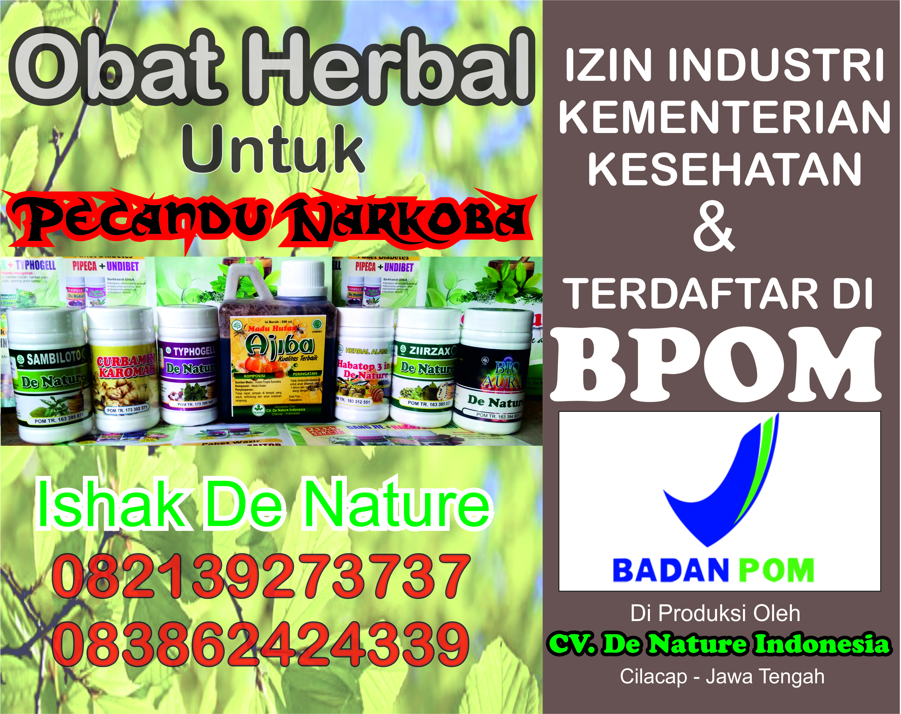 Kami De Nature Indonesia menjual Obat Untuk Pecandu Narkoba yang bisa mengurangi kecanduan narkoba dan bisa memperbaiki sel saraf saraf yang telah rusak akibat bahan kimia yang terkndung dalam Narkoba.